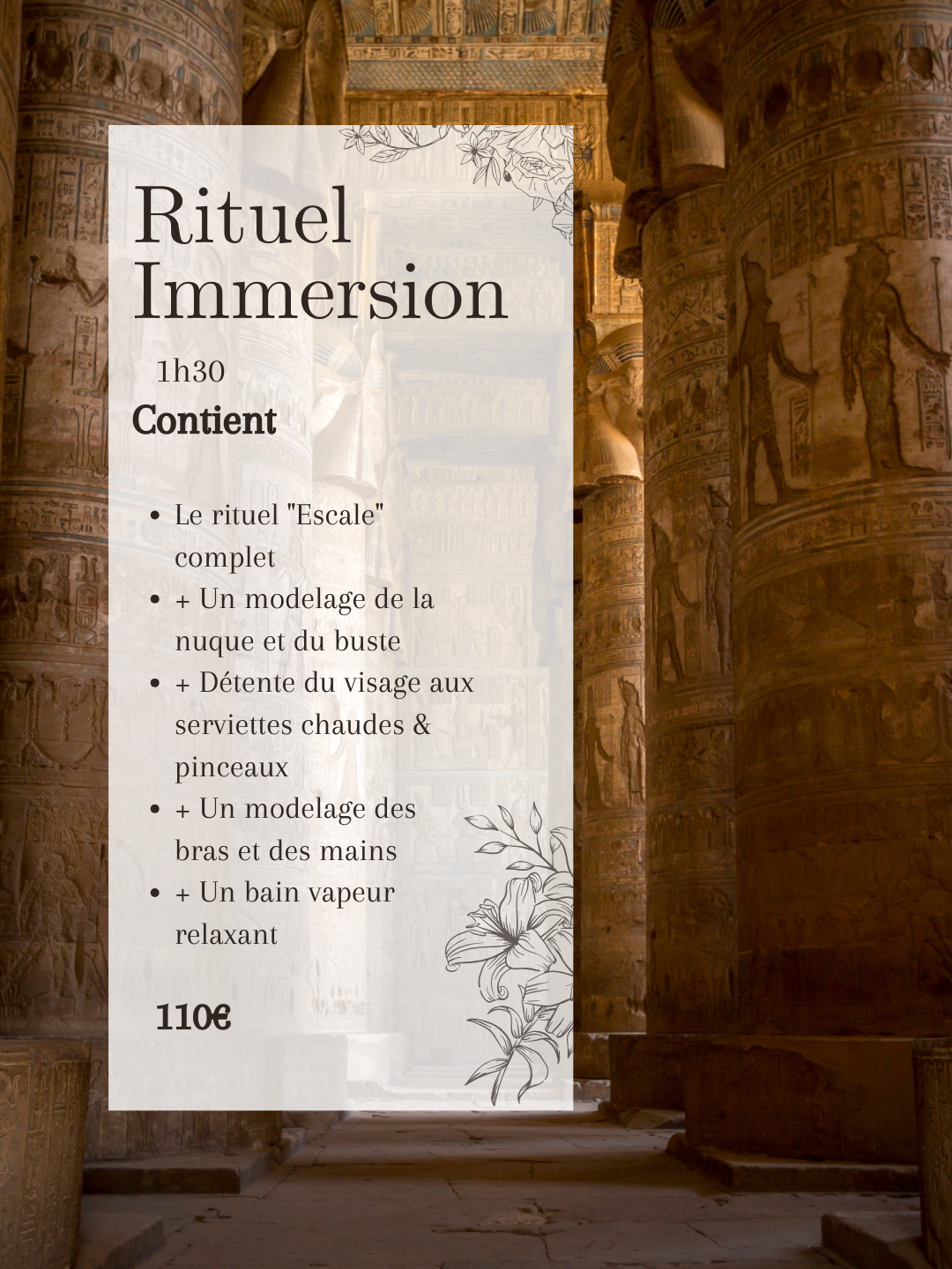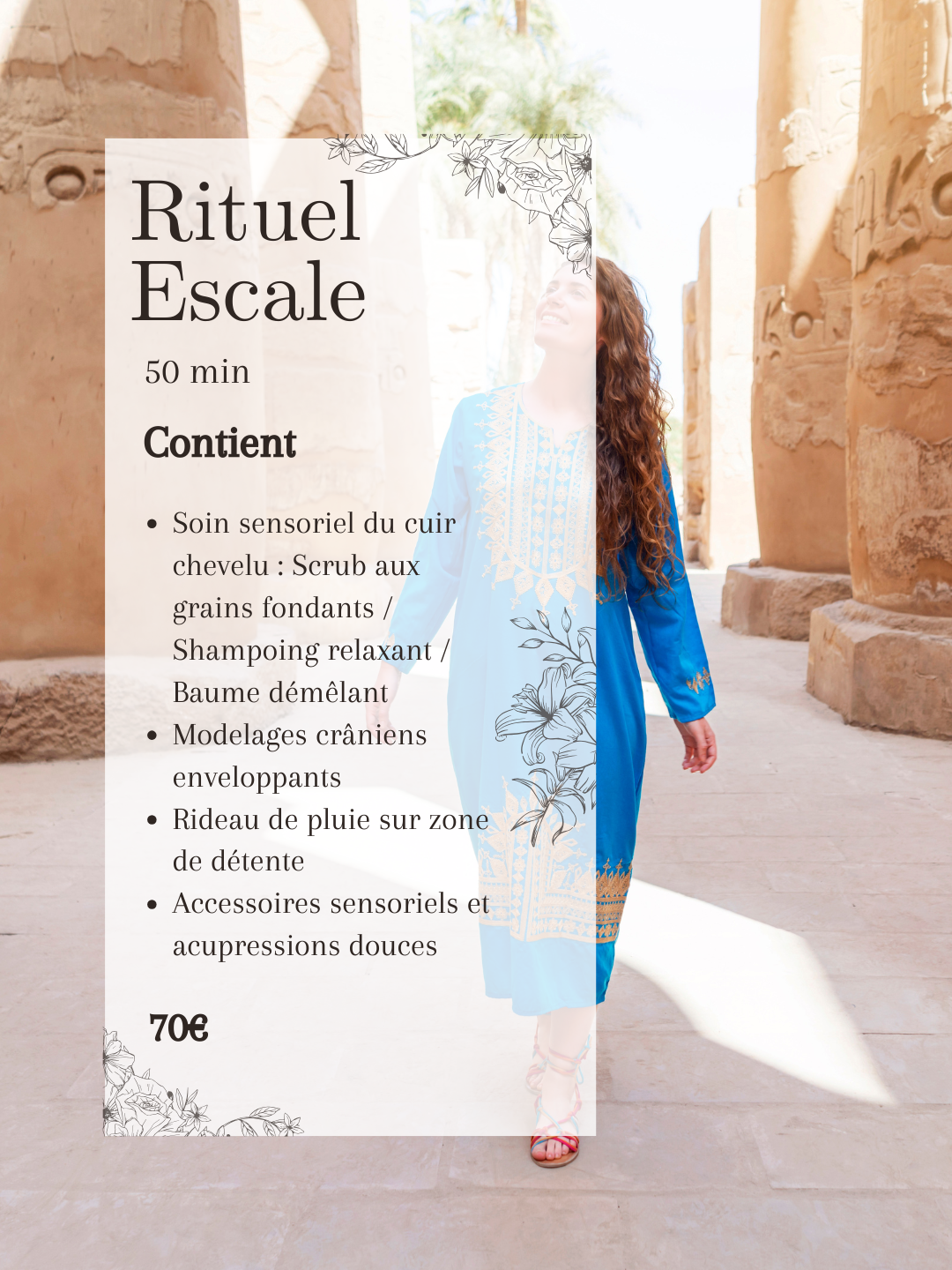 Cette Escale revisitée se prolonge par des modelages crâniens enveloppants, un rinçage aux hydrolats sacrés et un baume démêlant à la rose. Modelage du buste, de la nuque, puis du visage à l’élixir de jasmin accompagné de gestes sensoriels apaisants, bain de vapeur sensoriel et immersion vibratoire viennent sceller ce rituel sacré, porté par une ambiance Orient & Nature.